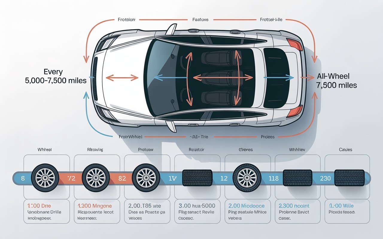 AWD vehicles often need rotation closer to 5,000 miles to prevent costly repairs.